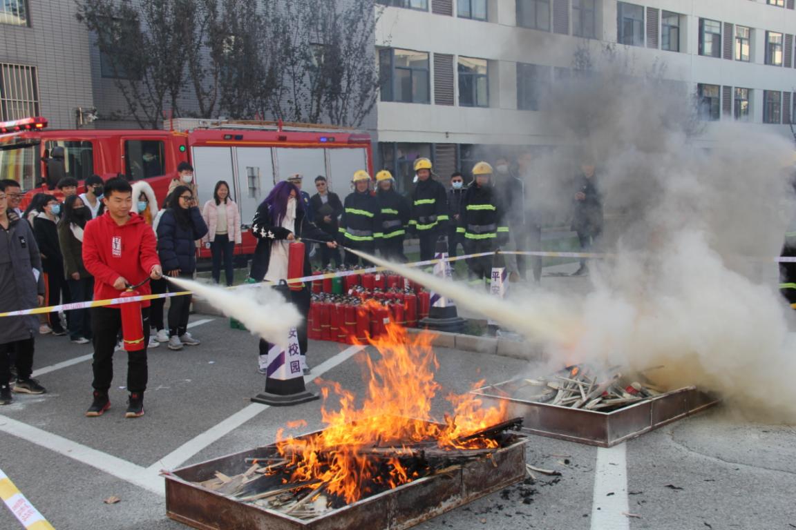 最后,在场同学在保卫处老师指导下有序进行了灭火器实操体验,学生们通过亲身体验用灭火器扑灭真火,对正确使用灭火器“一拔二压三对准”口诀更加了然于胸。