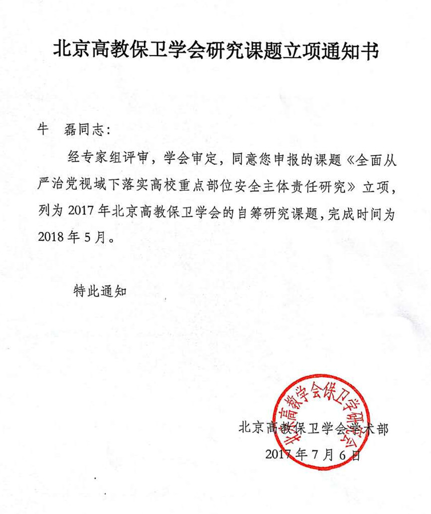 学校保卫处获批北京高教保卫学会2017年度研究课题立项