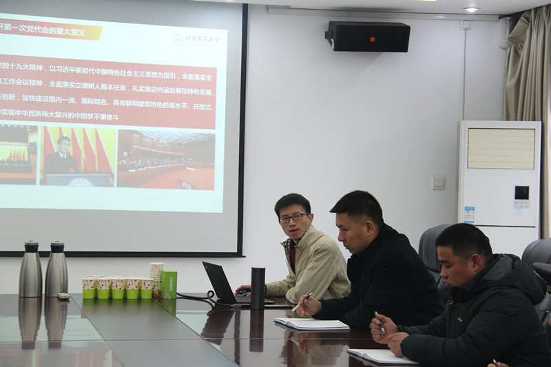 为贯彻落实十九大会议精神,深入学习我校第一次党员代表大会报告,将学校第一次党代会精神传达至每一名驻校安保队员,更好地确保校园稳定,保卫处于1月4日组织安保队员开展学校第一次党代会精神专题学习会。