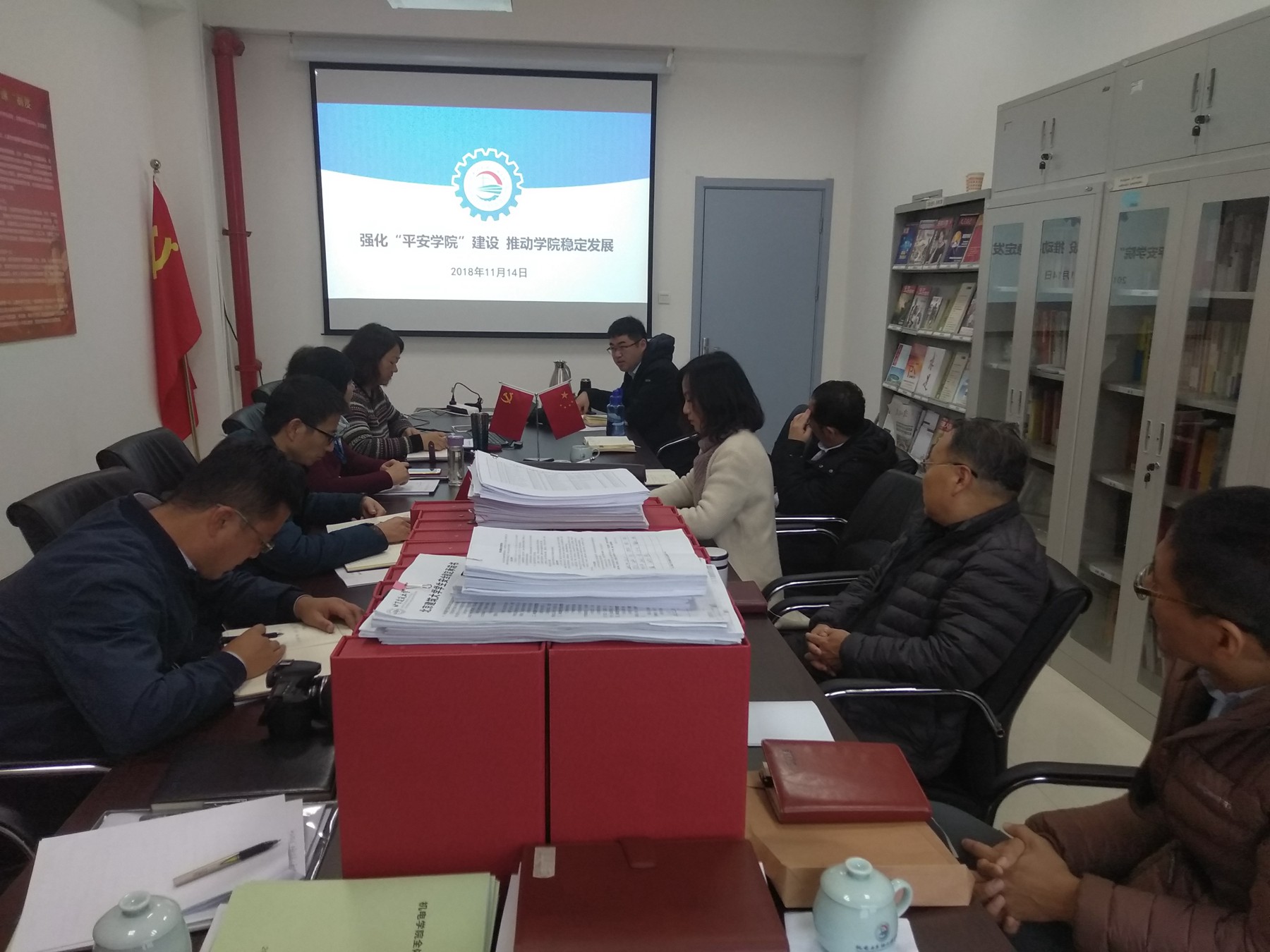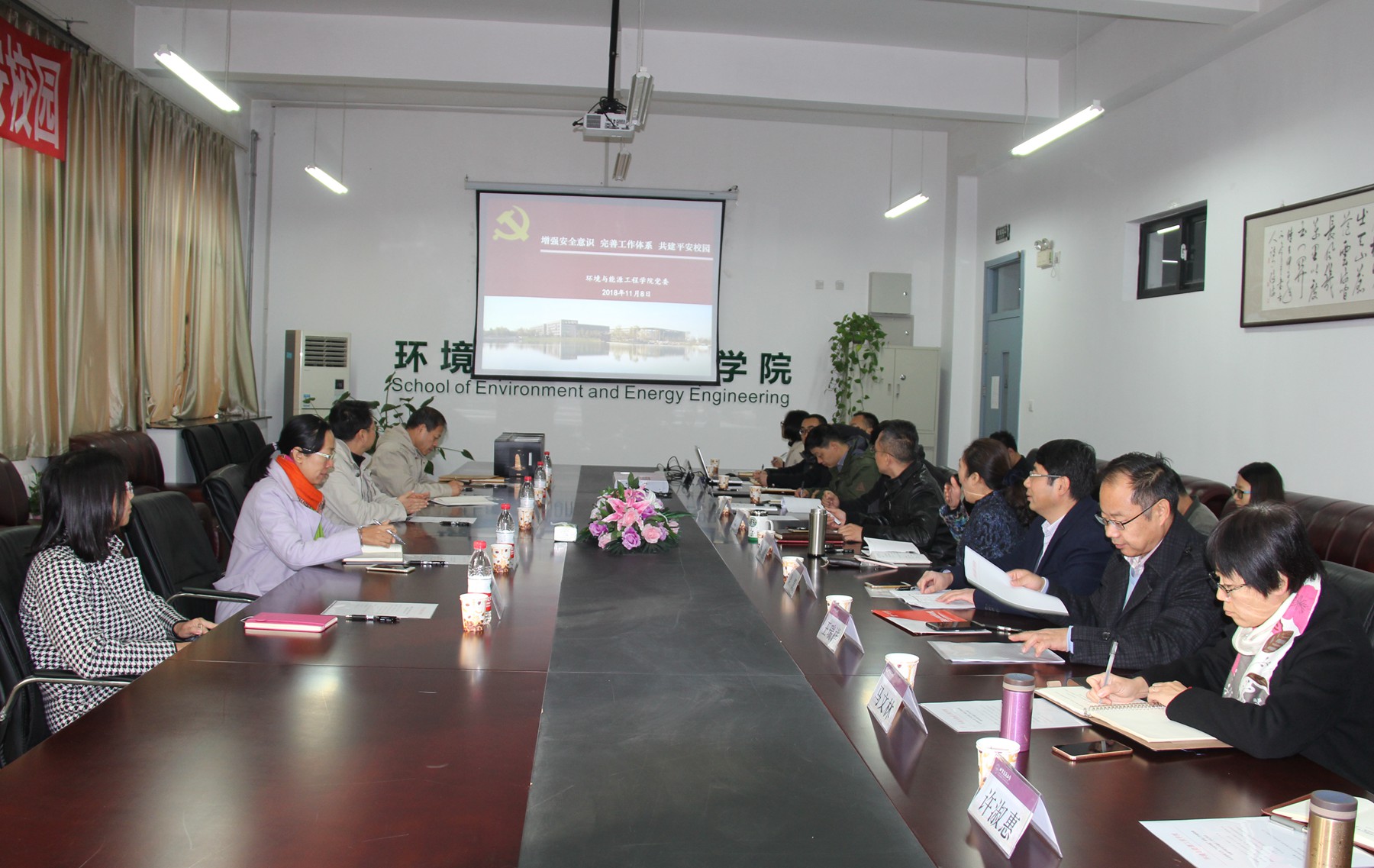 环能学院党委书记黄尚荣、电信学院党委书记张雷、文测绘学院党委书记王震远、土木学院党委书记冯宏岳、机电学院党委书记赵海云、经管学院党委书记彭磊、法学院党委书记刘国朝、理学院党委书记程士珍,分别结合各自学院实际,从制度建设、机制保障、具体举措、经验总结、问题不足等方面,做了“平安学院”建设的中期汇报,工作小组与各学院就“平安学院”建设中的有关问题进行了专题交流与研讨,并详细查看了各学院“平安学院”建设的各类材料。