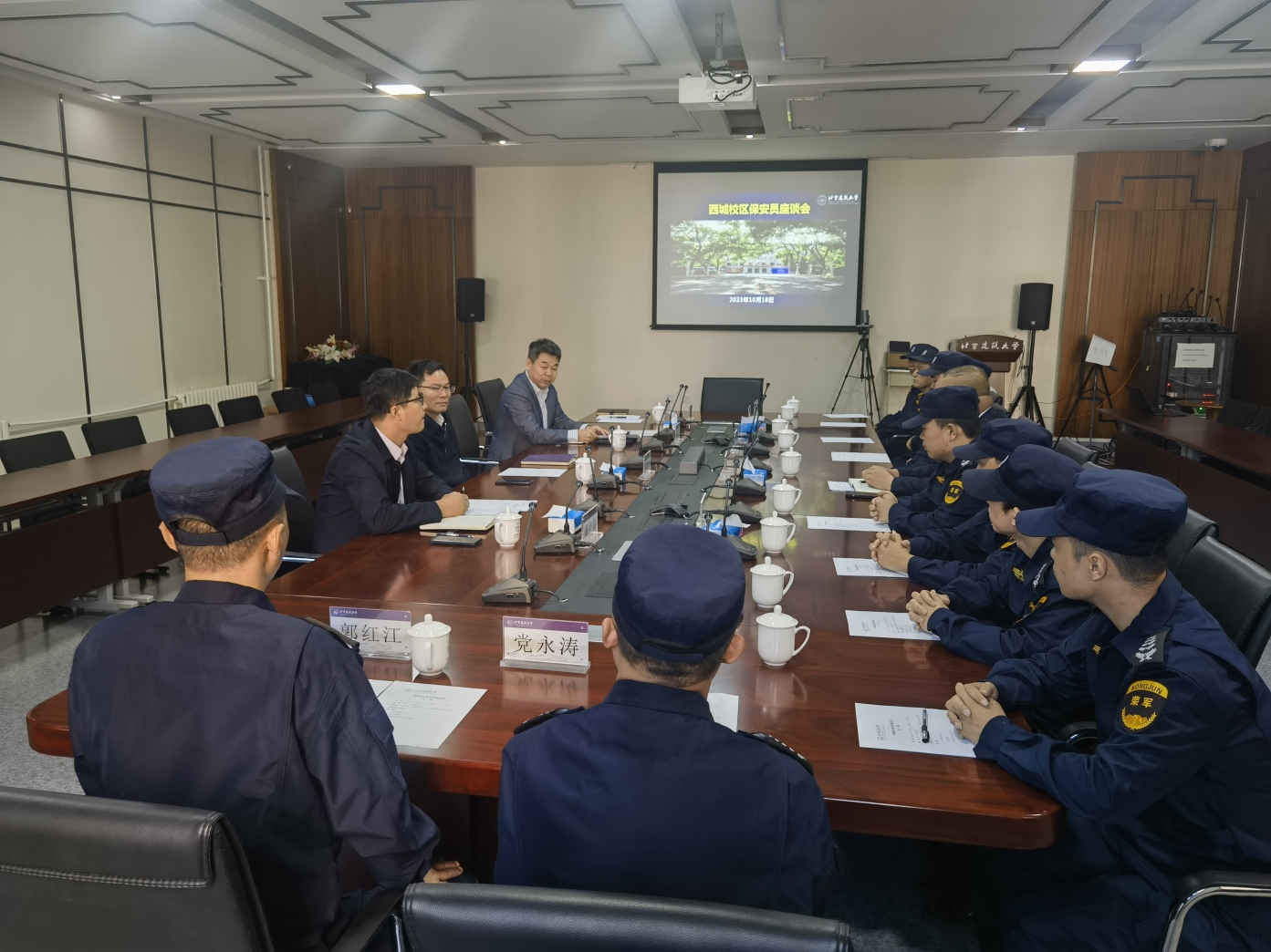 党委副书记王逸鸣发表讲话,他代表学校党委行政对全体保安员表示问候,对保安员的辛勤付出表示感谢。他表示,学校要进一步做好对保安员等学校服务人员的人文关怀,为家属来京探亲团聚创造条件。他指出,保安工作要做到原则性与灵活性的统一,在管理服务中要有温度,要体现出高能力和大智慧。他强调,保安队伍要参照半军事化管理,落实好各项规章制度。他提出三点工作期望,一是要爱建大,既来之则安之,要对学校充满感情地干工作;二是要守规矩,要严格落实好学校的各项管理规定;三是要讲文明,工作中遇到各类不文明行为要冷静,敢于善于用好技术手段同不文明行为作斗争。