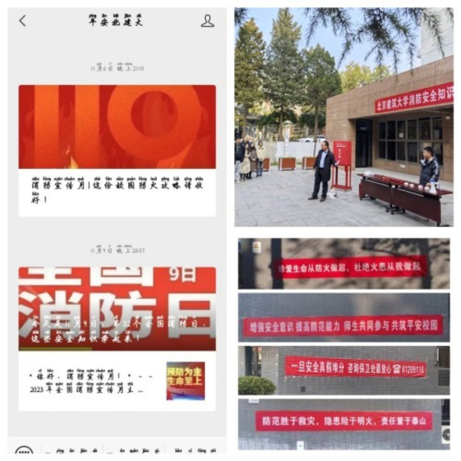 保卫处充分利用11月“消防安全月”契机,开展丰富多样消防安全教育活动;在两校区显著区域布置了消防常识横幅展板,“平安北建大”开展专项系列推送;开展“灭真火”、“出真水”消防演习,提升事故应对能力;以各种形式集中展示消防安全知识,营造良好校园安全氛围。