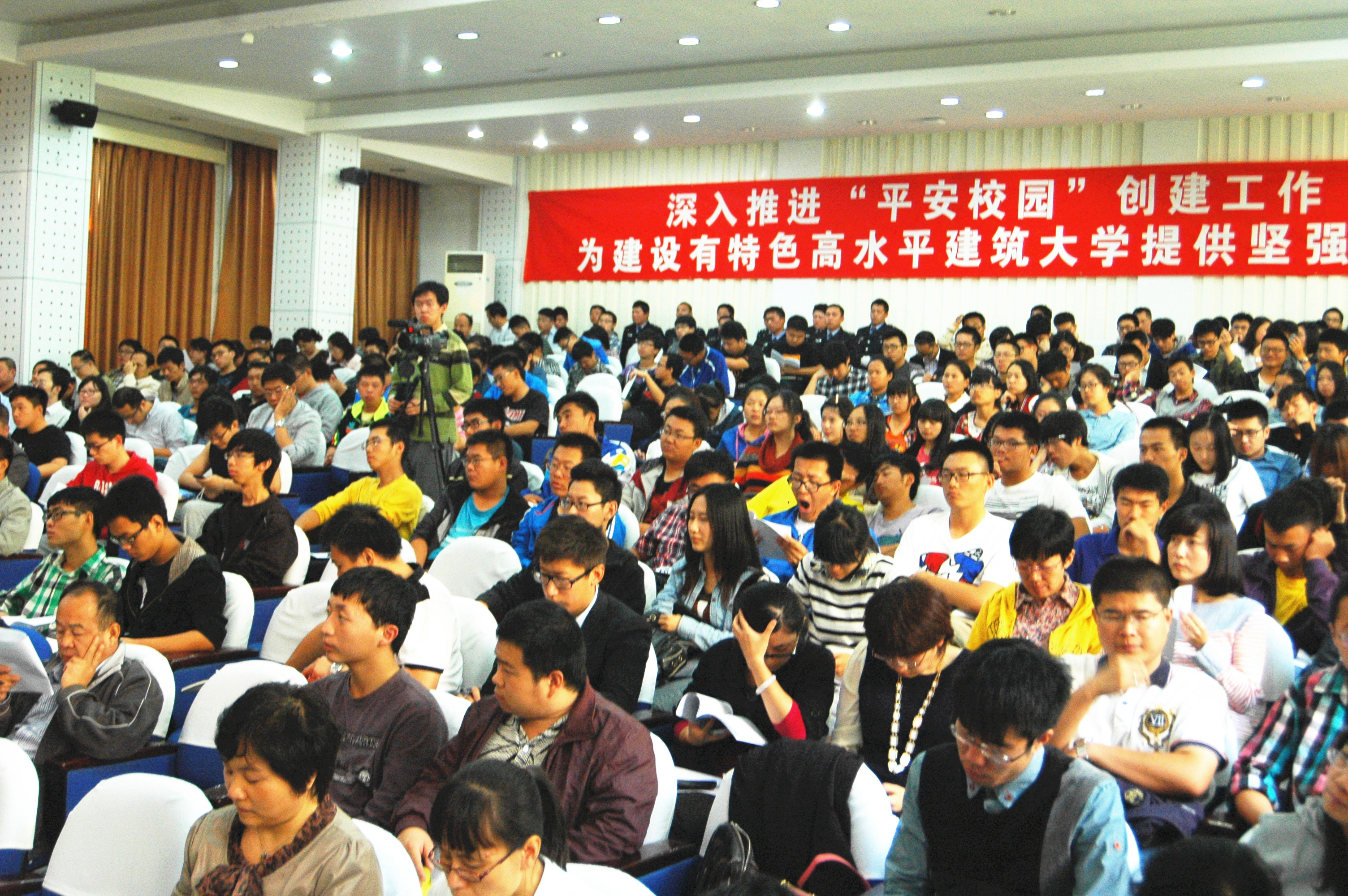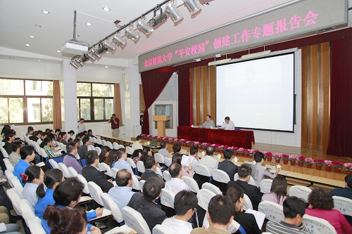 唐立军书记在报告中介绍了首都高校推进“平安校园”创建工作的背景、目前进展情况及取得的成绩,并重点阐述了三个方面的内容:一是要深刻认识首都高校推进“平安校园”创建工作背景意义。唐书记指出,创建“平安校园”,是深化平安“北京建设”、维护首都乃至国家改革发展稳定大局的根本要求,是推动首都高等教育科学发展、努力办好人民满意的首都教育的基本前提,是提升师生安全感和满意度、培养社会主义建设者和接班人的内在要求,是全面强化基层基础、整体提升安全稳定工作科学化水平的重要抓手。二是要统筹推进“平安校园”创建工作的重点任务。唐书记强调,“平安校园”创建工作要实现“大事不出,小事减少,管理严格,秩序良好”的总目标,在创建中要贯彻“抓好统筹,夯实基础,注重长效,服务大局”四个原则,要建设好“安全稳定组织领导体系、维护稳定工作体系、涉校矛盾纠纷排查化解体系、校园综合防控体系、校园安全教育管理服务体系、校园应急处置体系”六大体系。三是要准确把握好“平安校园”创建工作的总体要求。唐书记要求,在创建工作中要坚持“着眼大局、立足长远,全面建设、创新管理,安定和谐、科学发展”的要求,重点突出“重基础、重过程、重状态、重创新、重长效”,不断把创建工作推向深入,努力以安全稳定工作的科学化促进教育事业科学发展。唐书记在辅导报告中还介绍了已经通过达标验收兄弟高校的经验和做法,特别是在创建过程中结合学校实际、发挥学校特色和优势巩固安全稳定工作成效的做法。唐书记还对近年来我校的发展特别是安全稳定工作给予了肯定,并对我校顺利通过“平安校园”创建工作的达标验收充满信心。