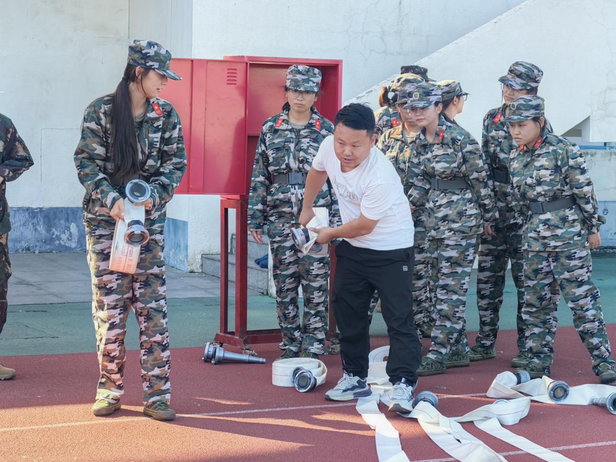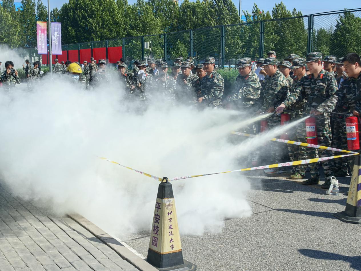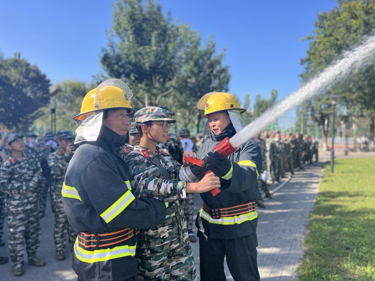 随后,参训新生在指定区域参加了消防设备展示及实操体验活动。现场设置了灭火器灭真火、消防水带实操出水、灭火毯油锅灭火、水带拼接、消防服试穿等多个体验项目。保卫处老师和微型消防站队员现场演示各类消防器材的正确使用方法,重点讲解干粉灭火器“提、拔、瞄、压”的操作要领。参训学生踊跃参与、动手实践,在模拟场景中掌握基本消防技能,有效提升应对突发火情的实战能力。