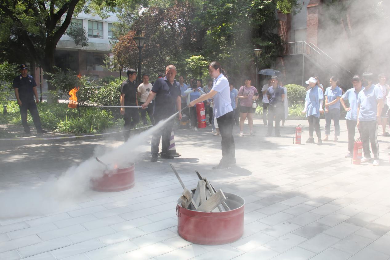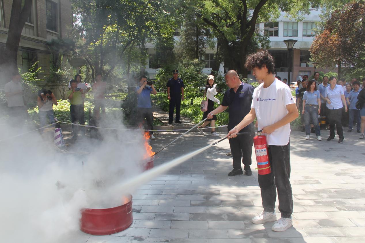 疏散演练结束后,保卫处消防科科长朱岩为现场师生员工进行了消防知识培训和消防器材展示,并对消防常用灭火器的使用进行了细致讲解。随后,全体人员齐聚灭火器实操点,动手演练和操作各类灭火器。讲解结束后,大家跃跃欲试,纷纷上场进行灭火体验,严格按照“看、提、拔、瞄、压”五步方法使用灭火器,最终成功将火扑灭。最后,属地消防站站长杨国兴对学校微型消防站队员进行了现场培训和指导,进一步强化“灭火器灭真火、消火栓出真水”等实操实训。