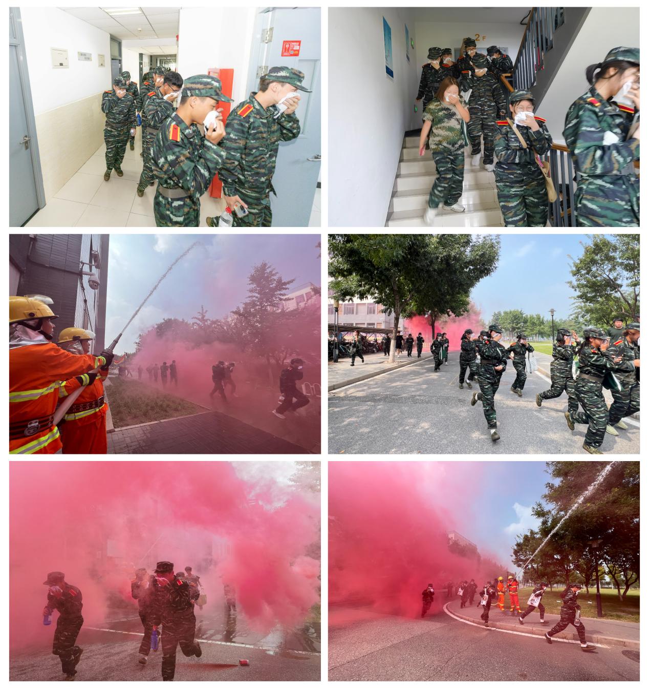 (学校保卫部、学工部、后勤处、微型消防站人员、辅导员及宿管人员,按照火灾应急处置方案,立即组织宿舍楼内学生进行疏散至预定安全区域集结)