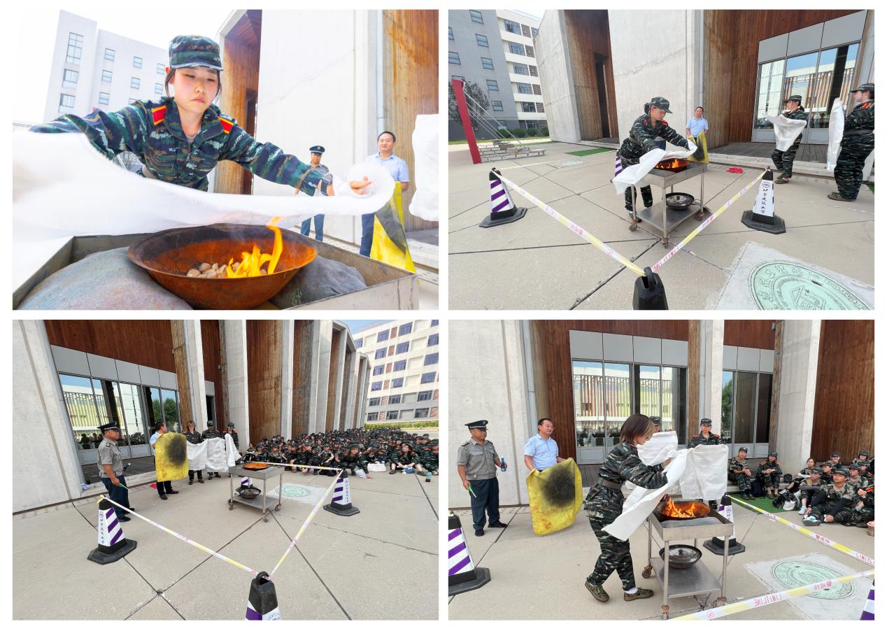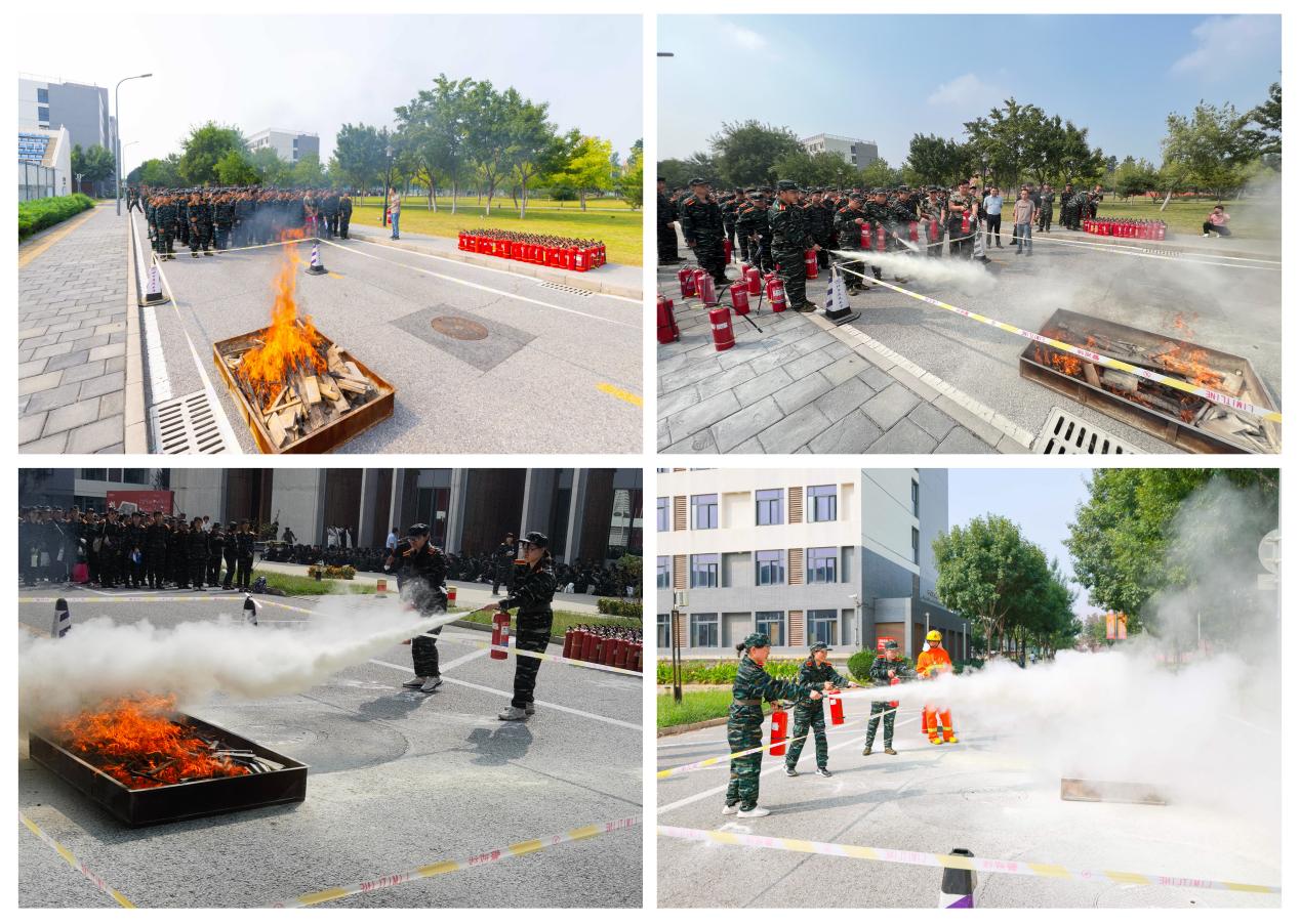 最后是本次演练的第二个部分——“消防救援技能实训”。学校保卫部为同学们带来了一场“即新颖、又刺激”的消防实训盛宴。在“灭火器灭真火”实训场,学校保卫处干部和微型消防站队员向同学们细致讲解灭火器的使用方法和使用技巧。讲解结束后,同学们跃跃欲试,纷纷上场进行灭火体验,严格按照“看、提、拔、瞄、压”五步方法使用灭火器,功将火盆中的火焰扑灭。在“单兵消防装备会穿戴”实训场,老师一边指导一边传授消防服如何穿戴,消防器材如何使用,让同学们有了亲自穿戴上身体验的机会,使消防知识和技能更加容易内化。同学们更是兴奋地纷纷“打卡”拍照发“朋友圈”。