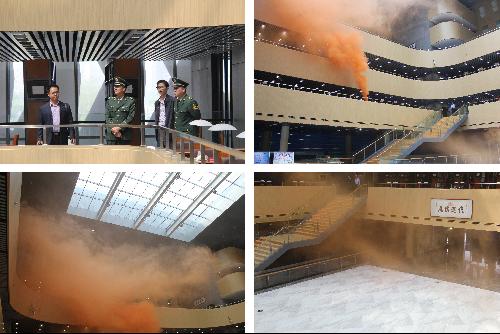 下午14:00整 预设模拟“火源”在图书馆内点燃 消防系统随之响应
