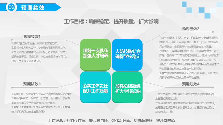 牛磊介绍了保卫处2017年工作重点及预期绩效。2017年保卫处工作目标是“确保稳定、提升质量、扩大影响”,并将“拥有存在感、提高参与感、强化责任感、增进获得感、提升幸福感”作为工作理念。重点工作一是用好三支队伍、加强人才培养;二是人防技防结合,确保学校稳定;三是落实主体责任,提升工作质量;四是加强总结凝练扩大学校影响。