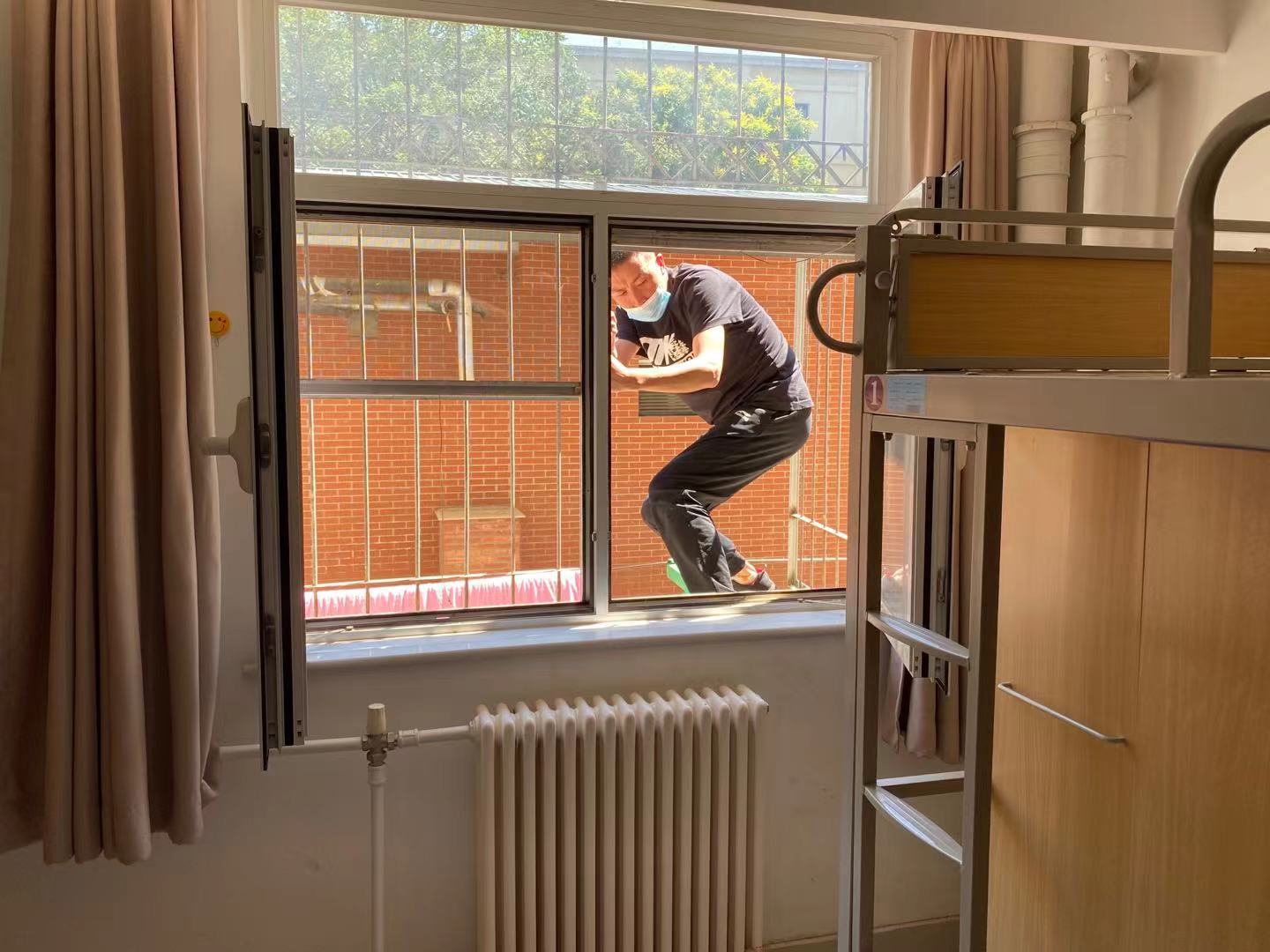 为检验学生宿舍一层窗户护栏改造结果,现场还进行了学生宿舍一楼房间窗户逃生演练,真实检验了学生宿舍护栏改造效果。