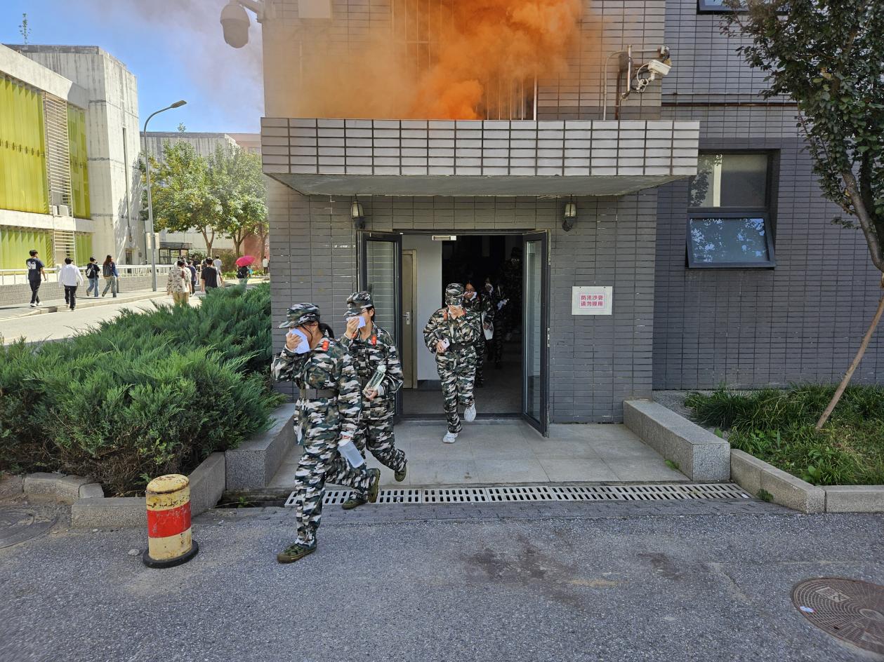 随着警报广播和人员疏散的哨声响起,“疏散逃生”开始。“浓烟”(消防演习模拟烟雾弹)已在楼内扩散,“请疏散撤离”的广播和救援人员哨声在弥漫烟雾楼道内响彻循环,同学们手持湿毛巾捂住口鼻,弯腰前行逃离“火灾现场”,在宿管阿姨、保安员、老师的指挥下有序疏散。