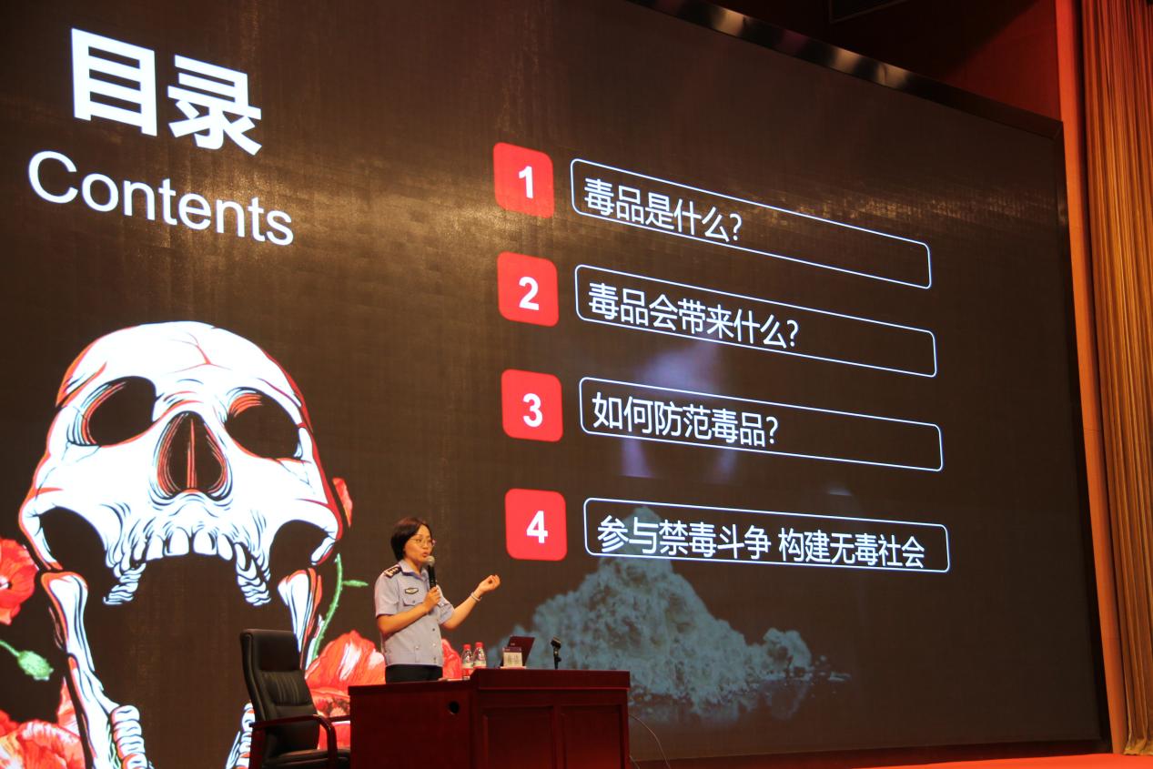 肖洁警官以“让青春远离毒品”为题,对毒品的起源、种类、危害以及如何防范毒品等情况进行了详细介绍。她通过深入浅出的讲解,真实且具有代表性的案例,提醒同学们要时刻保持警惕,告诫同学们要珍爱生命,远离毒品。更要对自己和对家庭以及社会负责,用健康、阳光的状态迎接大学生活。最后在肖洁警官的领誓下,全体同学进行了“远离毒品”的庄重宣誓。