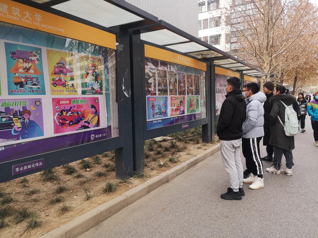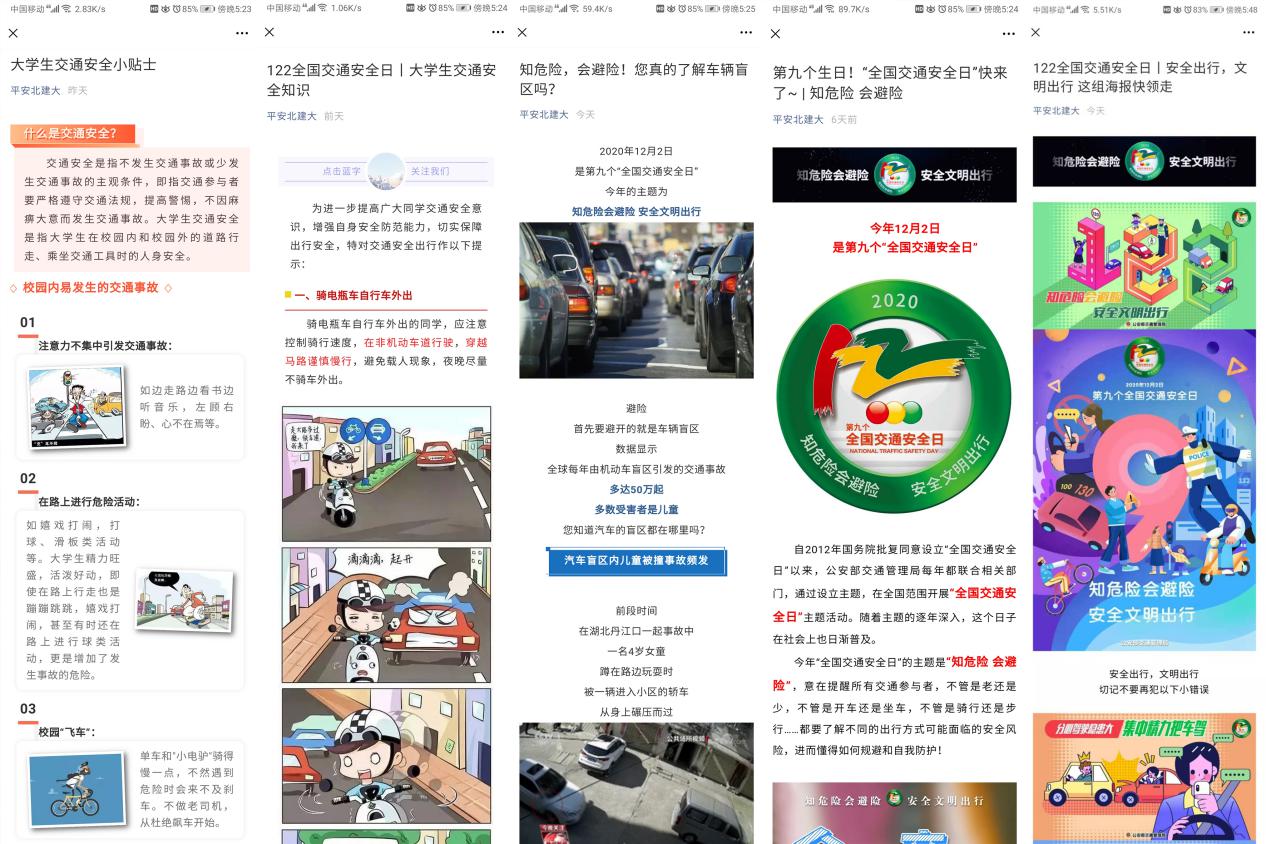 学校与公安部门联合,以宣传海报形式,在校内橱窗张贴宣传海报。同时,还积极运用新媒体,在校保卫处微信公众号“平安北建大”微信平台上进行专题推送,并转载和转发至校院两级的党支部、工会、教职工、学生班级等微信群,让师生员工深刻认识分心驾驶、闯红灯、超速行车、酒驾、超载、疲劳驾驶等带来的严重后果。与此同时还适时推送一些有关交通安全的应急知识、自救技能、预防技巧及相关信息等,在丰富安全教育内容与形式的同时,还能让观看者获得良好的阅读感,有效地提高安全意识和自我保护能力,是师生员工喜闻乐见的“安全教育”新途径。