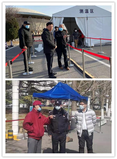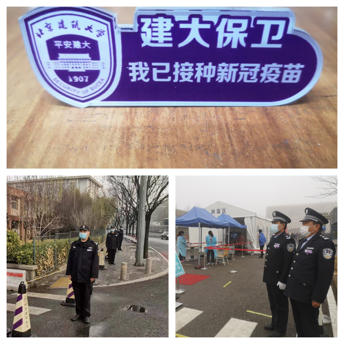 佩戴“我已接种新冠疫苗”胸牌站岗执勤的“建大保卫”人员