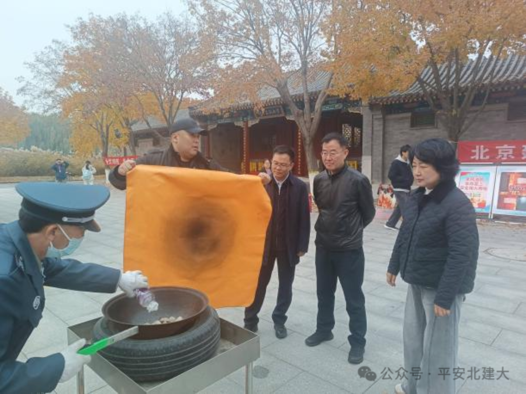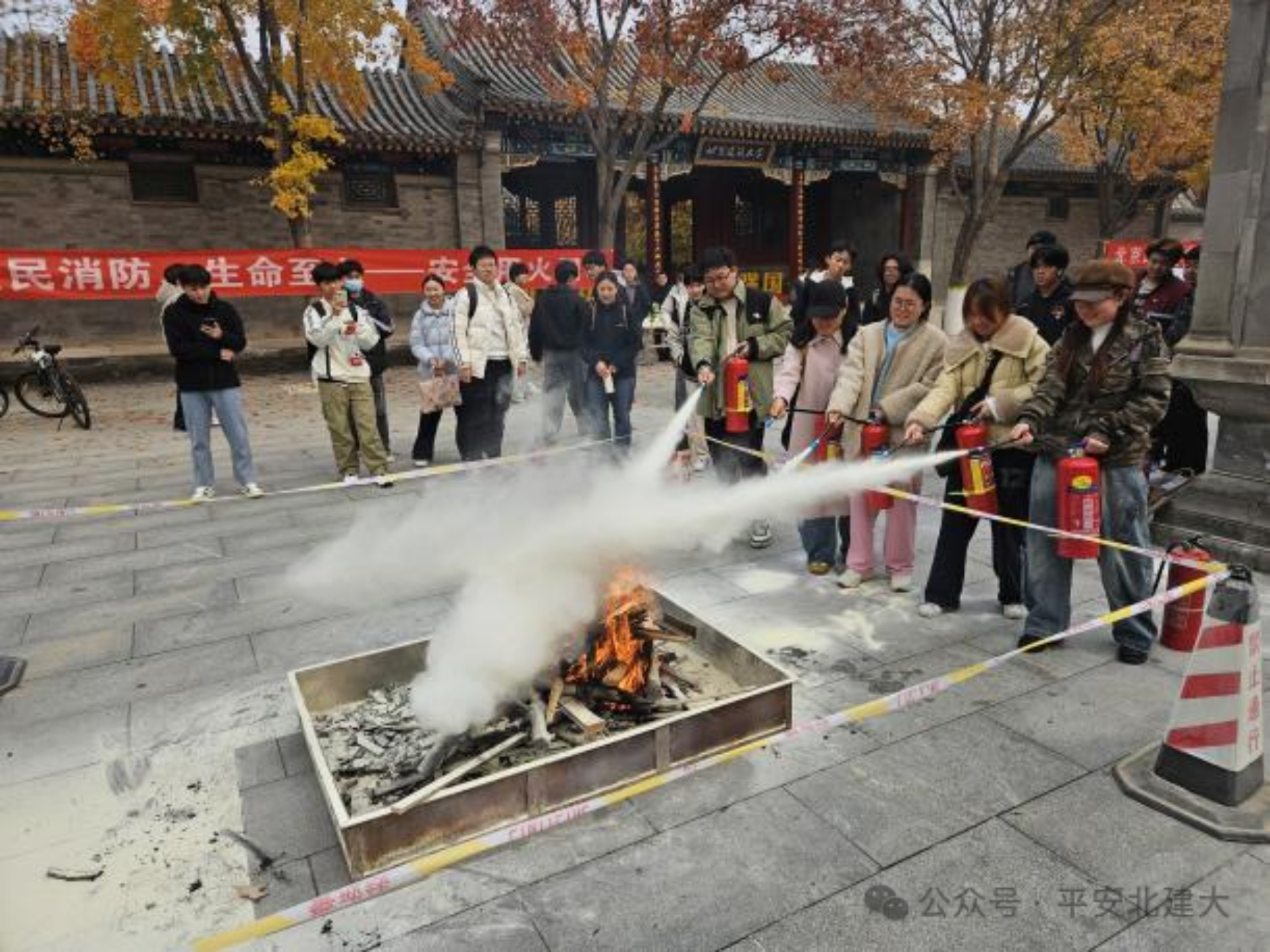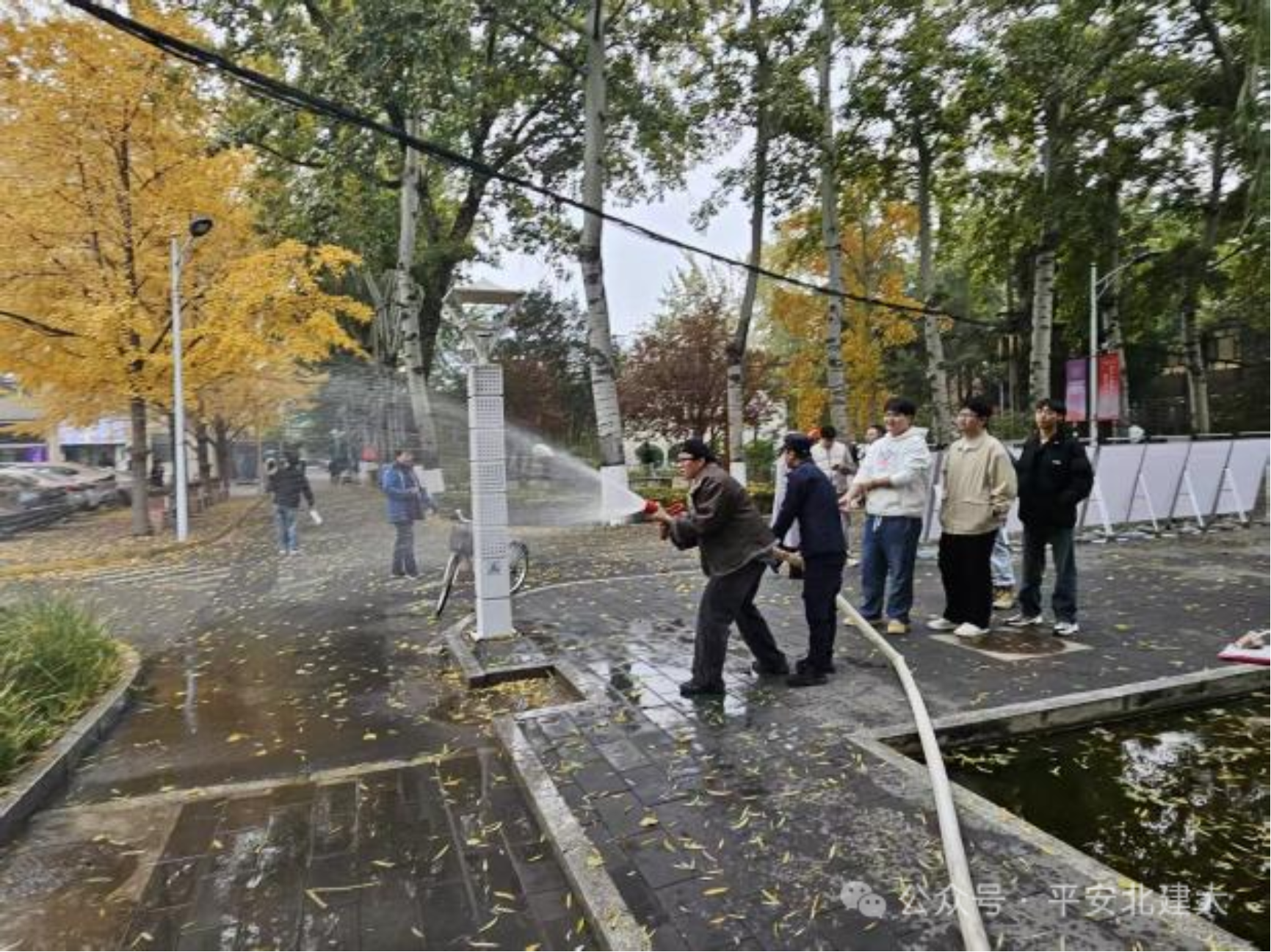 实操体验环节是本次活动的亮点,保卫处全程统筹协调,专业人员现场布置模拟火源并全程监护,确保活动安全有序开展。在大兴校区四合院院前和西城校区下沉广场,参与者分组体验三大实操项目:消防水带展开、接口连接与双人配合出水精准命中目标,考验团队协作与操作熟练度;干粉灭火器灭真火演练中,大家严格遵循“提、拔、握、压”步骤,成功扑灭模拟火源;灭火毯“窒息法”灭火实操则还原实验室操作台及厨房油锅起火场景,让参与者掌握近距离灭火的关键技能。